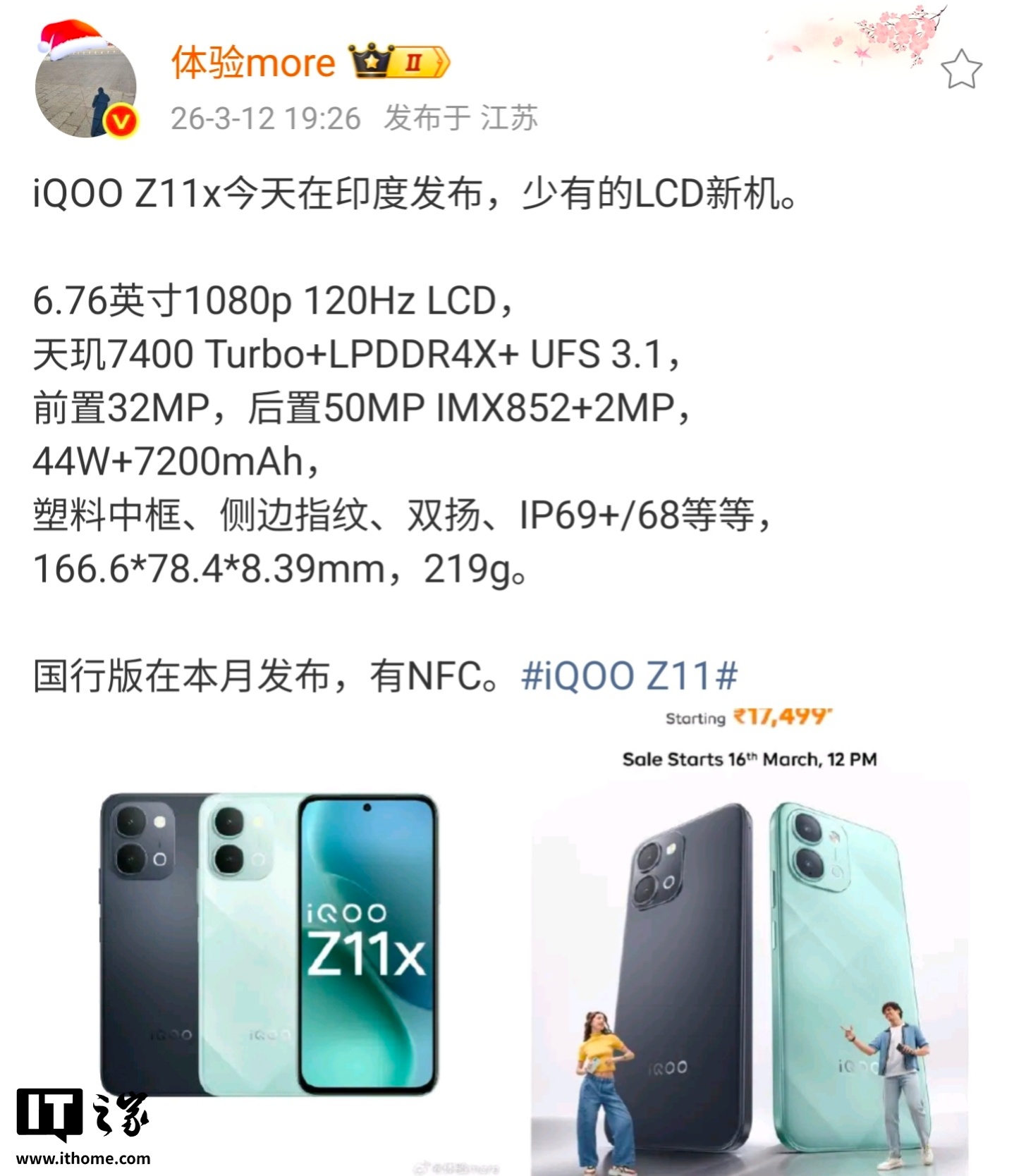 IT之家3月14日消息,3月12日,博主@体验more透露iQOOZ11x国行版本月发布,有NFC功能,此前已在印度发布。IT之家整理如下:6.76英寸1080p120HzLCD屏天玑7400Turbo+LPDDR4X+UFS3.1前置32MP镜头,后置50MPIMX852+2MP镜头44W快充+7200mAh电