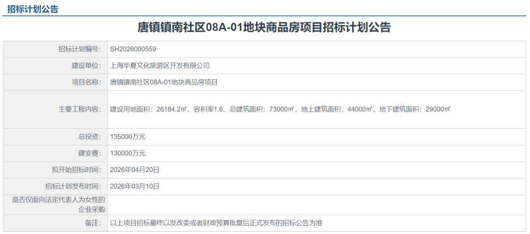 上海进深李誉 近日,唐镇镇南社区08A-01地块商品房项目招标计划公告发布。建设单位为上海华夏文化旅游区开发有限公司,由沈浩宇担任公司法人,是浦发集团旗下的子公司。这也意味着,唐镇08A-01地块已确定将会是浦发唐城六期项目。规划调