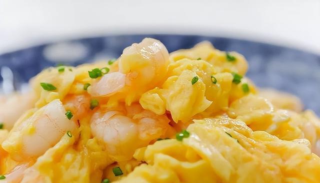 5、起锅烧油,将搅拌好的虾仁鸡蛋放入锅中,用锅铲轻轻推动几下,蛋液凝固后,撒上葱花,即可出锅装盘。