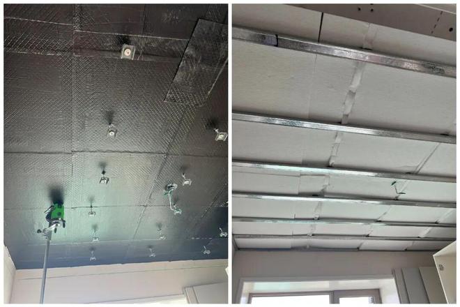 1、顶面隔音:采用了隔音粘+减震器+龙骨+吸音棉+隔音板+石膏板方案,完成面会整体下降11cm。虽然牺牲了一点房屋层高,但在我看来是十分值得的。