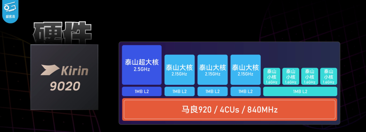 跟前代8000,采用与麒麟9000同时期的公版核心不同,麒麟8020也上自研IP。