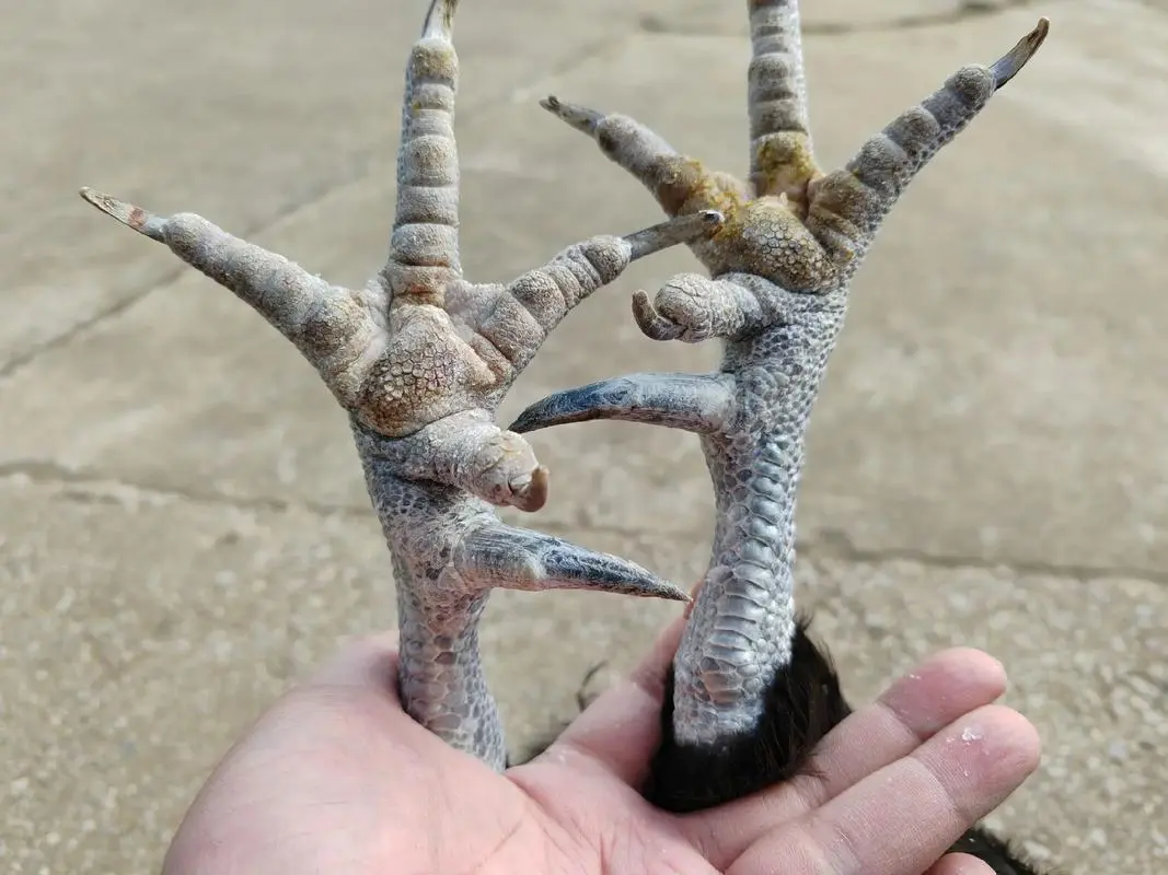 这是鸡最强大的武器,当然是说攻击,如果你观察过散养的公鸡打架就会发现,它们擅长跳起后用蹬爪攻击,这个蹬爪会随着公鸡的年龄增长而变长,它垂直于鸡脚、末端非常的尖锐,农村好斗的公鸡打架时一旦蹬到对方,即使对方是羽毛茂盛的大公鸡也会被蹬伤。