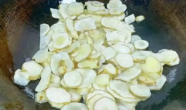 锅烧热后倒油,油温升高后放入蒜片爆香,等到蒜片的香味出来,就可以把切好的鬼子姜片倒进去,快速翻炒,让每一片鬼子姜都均匀地裹上油。这时候能听见锅里“刺啦”作响,鬼子姜的清香也慢慢飘出来了。