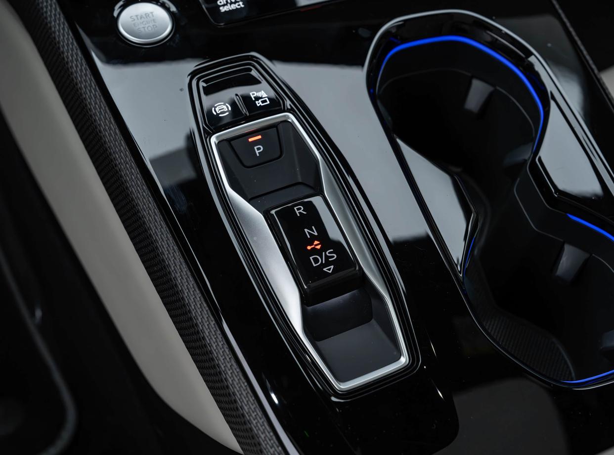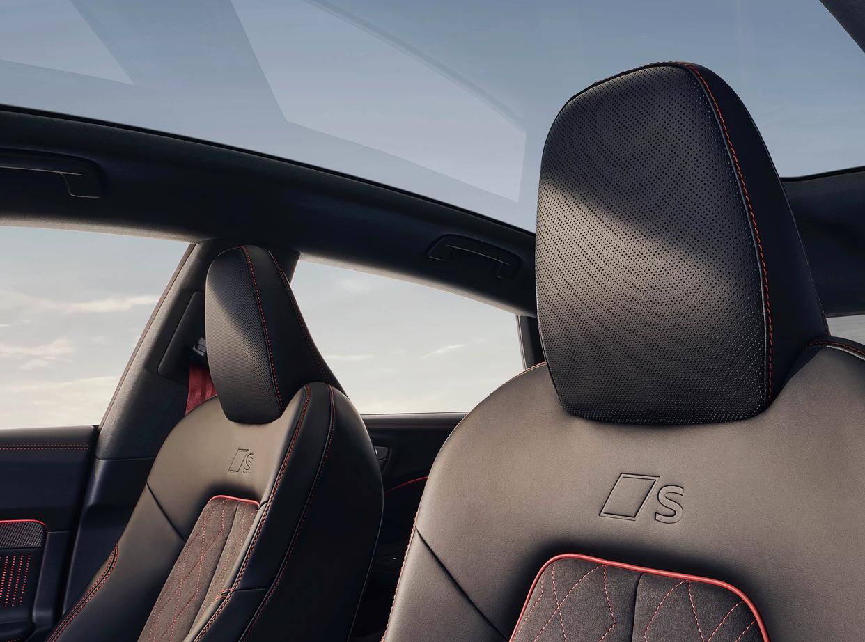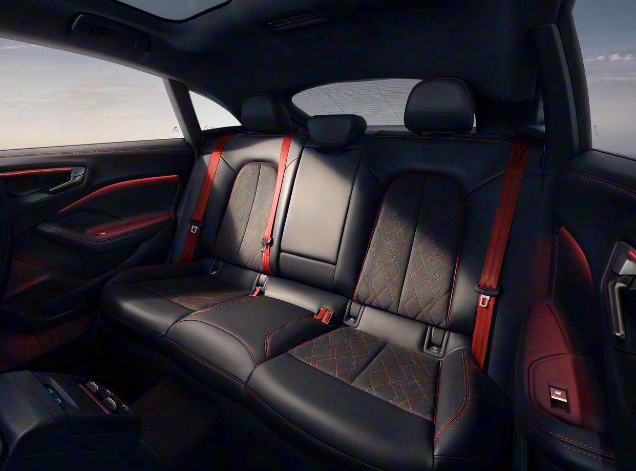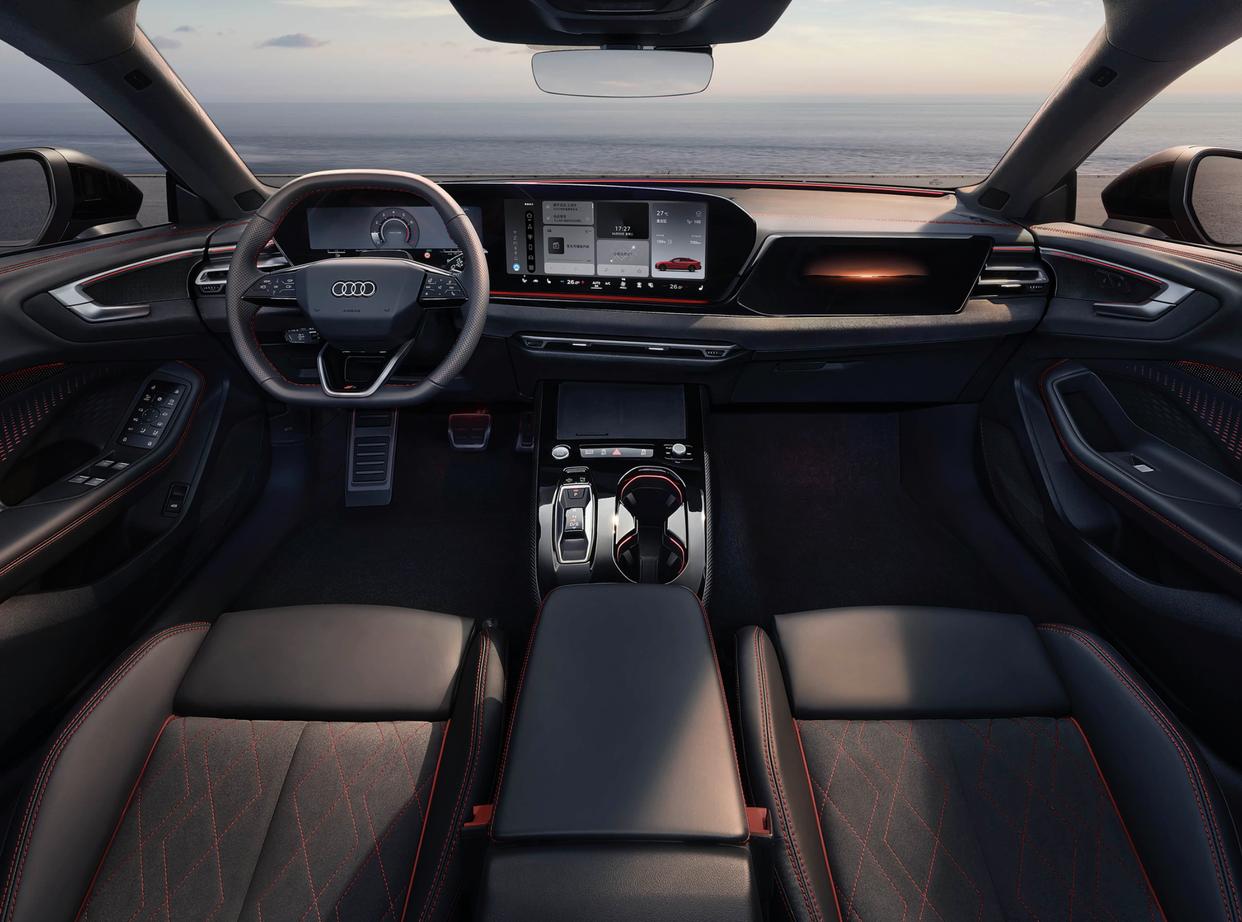 进入座舱内部,上汽奥迪A5L Sportback采用了深灰色为主的色调搭配,大面积雾面磨砂材质的包裹,再加上亮黑色钢琴烤漆装饰面板以及银色金属材质的点缀,还加入了红色的双缝线工艺,还有红色的安全带,带来了柔软细腻的质感,上乘的工艺也营造出更多的高级感。环抱式的中控台配备了11.9英寸液晶仪表+14.5英寸中控屏共同组成的曲面一体屏,副驾前将配备10.9英寸娱乐屏。操控性方面,该车配备了平顶平底的多功能方向盘,左右两侧功能区采用了新一代的背光触控式设计和大尺寸换挡拨片,操控岛区域更加简约,加入了按键式换挡机构,两侧还有两个标准的杯架。