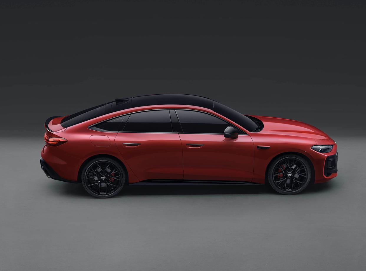 来到车身侧面,上汽奥迪A5L Sportback沿用了历代A5经典的溜背设计,更加倾斜的A柱、弧线形的车顶以及溜背式车尾,再搭配着若隐若现的灵动腰线设计,让整车更加优雅、耐看。四个隐藏式门把手、无边框车门、黑色的车窗边框饰条、黑色的渐进式轮眉以及黑色碳纤维宽体侧裙,给人带来了性能车的既视感。标配的20英寸RS锻造轮圈、银色的大尺寸刹车盘和红色的刹车卡钳,就连隐藏式门把手都采用了黑色设计,再搭配着碳纤维外壳的倒车镜,更加耐人寻味。尺寸方面,该车的长宽高分别为490318831427mm,车身轴距2922mm,是一款5门5座的掀背车型。