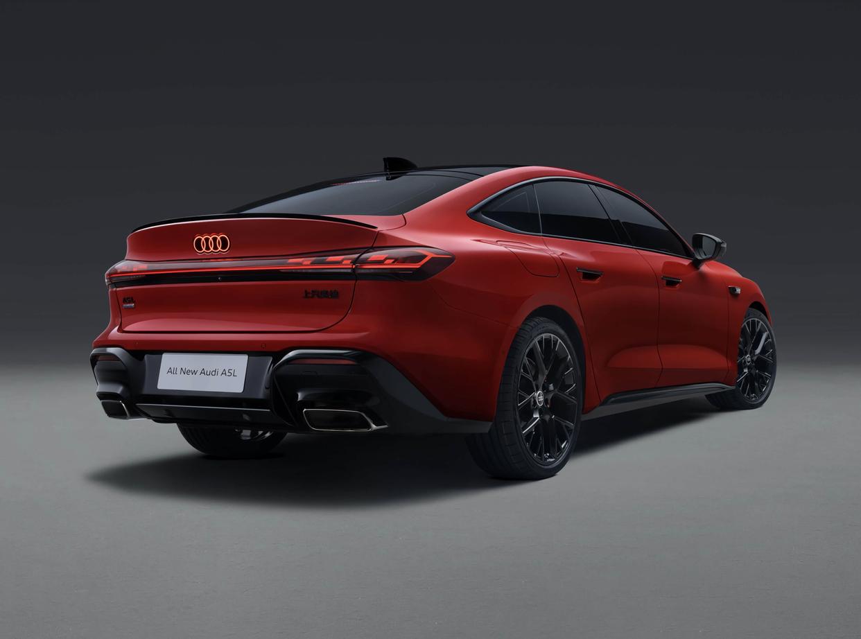 颜值表现方面,上汽奥迪A5L Sportback也带来了十分惊艳的感觉,U字形的前舱盖加入了向中心聚拢的凹槽,硕大的六边形格栅搭配着鳞次栉比的鳞片状中网,可发光的格栅变化、内部发光的奥迪四个圈车标,搭配着两侧造型犀利的前大灯(内部加入了全新矩阵式LED大灯,支持8种数字化个性签名),让整个前脸更有辨识度,科技感与时俱进。前包围两侧配备了硕大的矩形导流槽,亮黑色的边框与格栅的外边框形成一个整体,再搭配着纤薄的黑色碳纤维前铲,整体性更强,也更有侵略性。车尾层次感鲜明,上翘的后扰流板外加了纤薄的碳纤维尾翼,搭配着夸张的底部扩散器和双边四出的金属排气尾喉,强化了整车的运动气息。贯穿式的尾灯经过熏黑处理,内部采用了第二代OLED技术,内部配备悬浮式灯组模块,增添了更多的性能车味道。