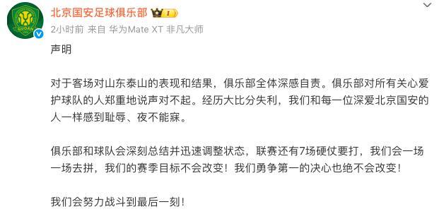 国安在声明中写道:“对于客场对山东泰山的表现和结果,俱乐部全体深感自责。俱乐部对所有关心爱护球队的人,郑重地说声对不起。经历大比分失利,我们和每一位深爱北京国安的人一样感到耻辱、夜不能寐。”