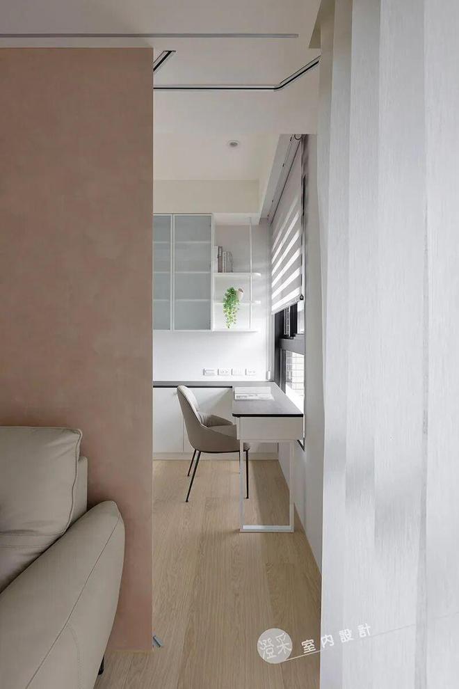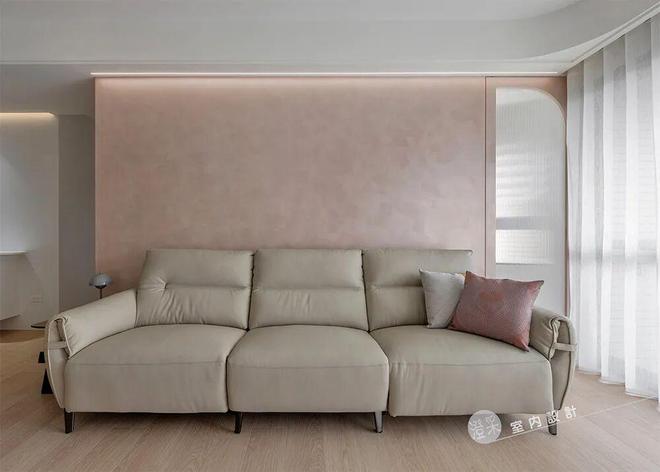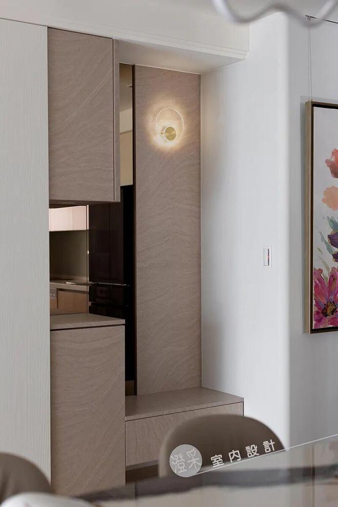 内缩深度理顺动线,暖粉系柜体 + 穿鞋椅一体设计