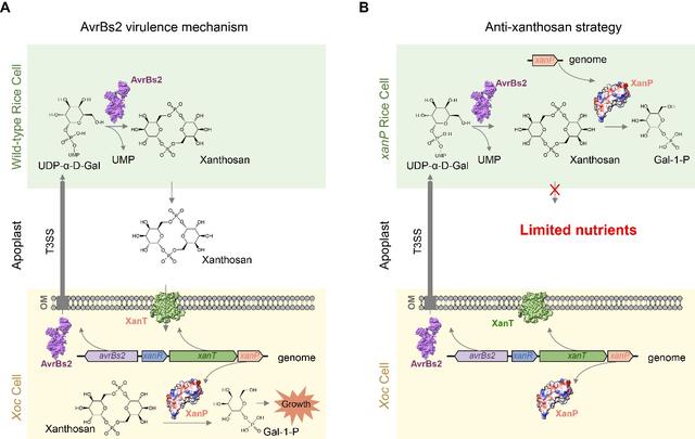 王善之研究员的研究终于解开了这个谜团。团队发现,AvrBs2实际上是一种“营养合成酶”。它被病菌注入水稻细胞后,会在细胞内合成一种环状糖类物质——黄单胞糖。随后,这种糖被排出细胞外,由潜伏在叶片细胞间隙的病菌通过其细胞膜上的特定“运输蛋白”吸收进体内。细菌内部还有一种“分解酶”,能将黄单胞糖分解成可直接利用的营养物质,从而支持病菌大肆繁殖。