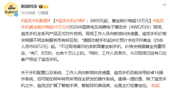 【CNMO科技消息】3月12日,在2026中国家电及消费电子博览会(AWE 2026)现场,追觅科技正式展出了其手机全系列产品,宣告跨界进军高端智能手机市场。据“新浪科技”报道,追觅手机将根据定制服务的不同拉开价格区间,旗舰功能机起步价999美元(约合人民币6872元)。而展台上多款采用真金、宝石镶嵌的高奢定制手机,价格则按黄金克重计算,“有7、8万的,也有十万以上的”。令人意外的是,开展首日已有数位高端客户现场下单预定。