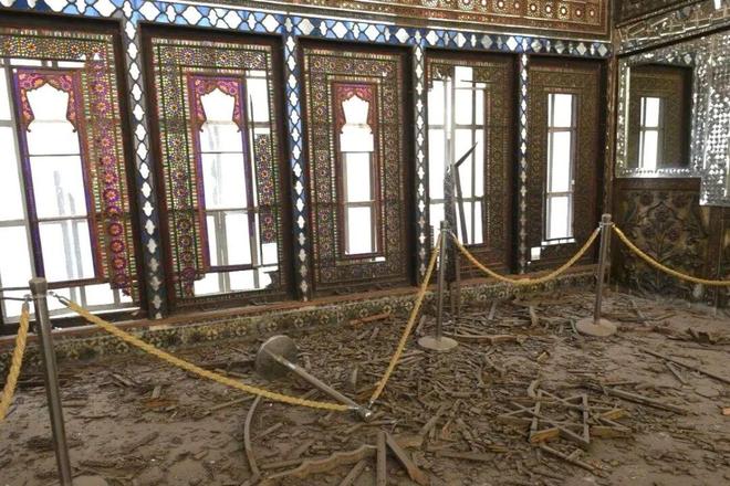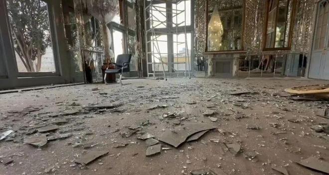 曾经流光溢彩的镜厅,穹顶塌陷、水晶灯轰然坠落,数万片手工打磨的彩色镜面镶嵌大面积碎裂,玻璃门窗全毁,碎片铺满了华丽的地毯;