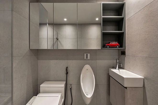 除了篮球,两人共同倾心的Mini Countryman,也成了全屋设计的隐形线索,每一处都藏着懂的人才懂的默契:电视主墙摒弃常规方框,复刻Mini仪表盘造型,整面带状背景+标志性圆形元素,高级又有辨识度