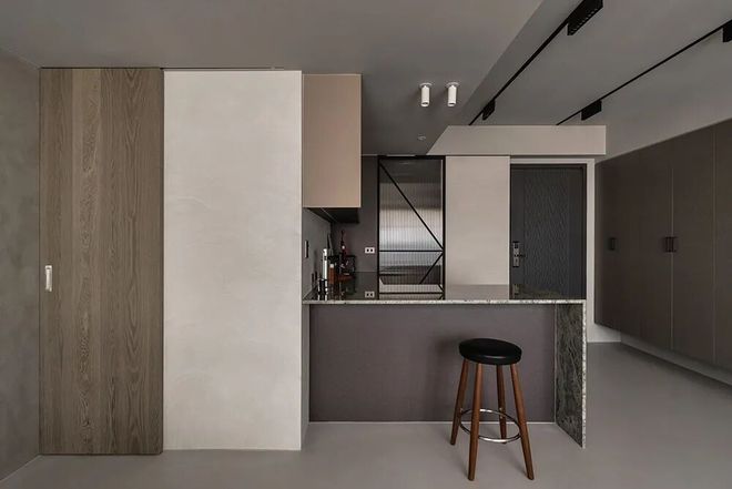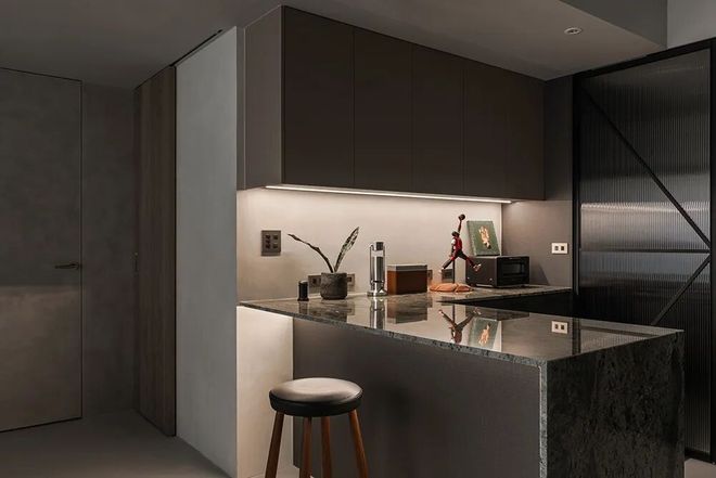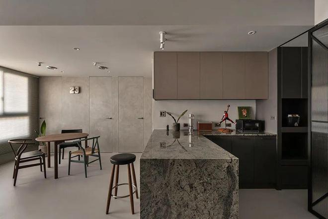 餐厨设计:中岛落置在大门一侧,特意微幅退缩了尺度,使廊面保有余裕之外,中岛采用天然大理石材质,并且选用相似于休旅车的灰绿色,使设计元素互为贯穿,让家景回应生命故事,得以愈形完整。