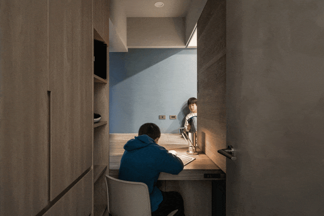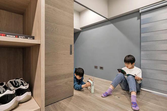 把其中一房一分为二,用超大拉门做隔断,既是独立私密的儿童房,又能合并成超大玩乐区,动线流畅无阻碍,空间有弹性,心也更开阔。