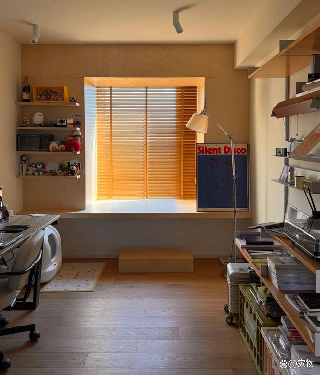 飘窗也同样保留了下来,周围直接做墙面书架,收纳书籍唱片和其他杂物,看起来乱中有序,有种“杂货铺风格”的美感,我个人还是挺喜欢哒~