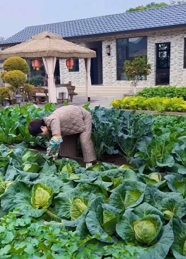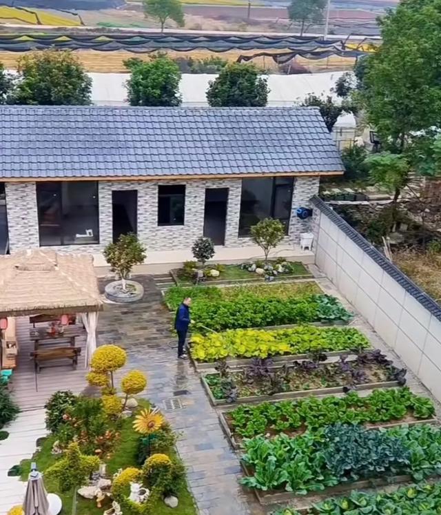 镜头往右移,我们来看看院子的右半部分。可以看到老钱把这一半规划成了菜地,划分成了一条一条的菜畦,里面种上了各种时令蔬菜,想吃就到院子里摘,新鲜、绿色又健康。