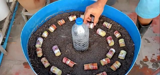 ④把它们尽量的百分整齐,芽点朝上,覆上一层土壤,把甘蔗完全遮住,再浇上定根水,要把水浇透。