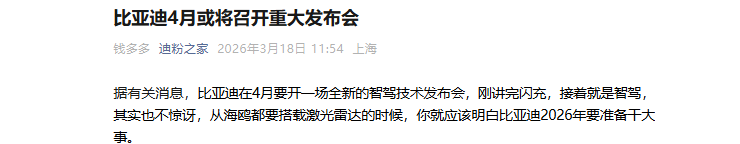 【CNMO科技消息】3月18日,据“迪粉之家”报道,比亚迪预计将于4月召开一场全新的智能驾驶技术发布会。这距离其3月5日发布第二代刀片电池和闪充技术仅过去一个月,届时或将正式宣告其战略重心从“电动化”转向“智能化”。