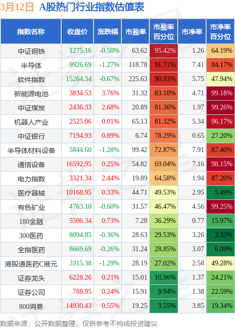 热门行业指数方面,中证钢铁的市盈率百分位较高,为95.42%。而800消费的市盈率百分位较低,为9.55%。