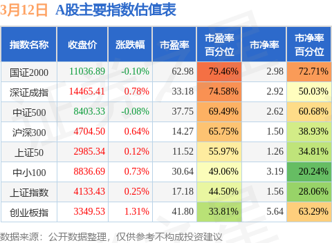 证券之星消息,3月12日A股收盘,上证综指指跌0.1%,报收4129.1点;深圳成指跌0.63%,报收14374.87点;创业板指跌0.96%,报收3317.52点。