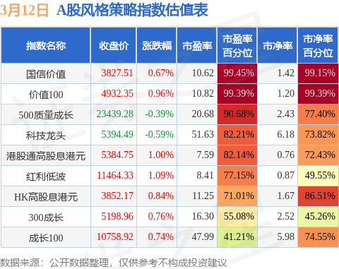风格策略指数方面,国信价值的市盈率百分位较高,为99.45%。而成长100的市盈率百分位较低,为41.21%。