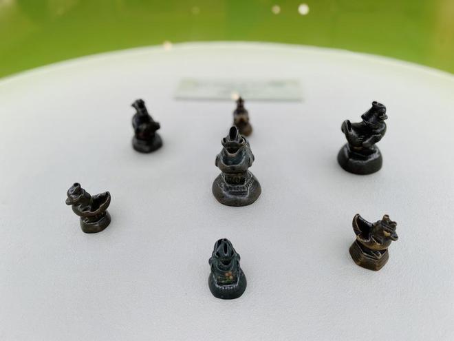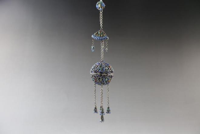 展出的元代鸭形青铜权以鸭坐六角方台之上为造型,颇具妙趣。鸭昂首挺胸,扁嘴翘尾,惟妙惟肖;清代银烧蓝香囊整体由银链串联为三层,最上方为圆形昆虫造型,中间为三角状蝶形,下层则为镂空的球状主体,整体制作精美、工艺复杂。