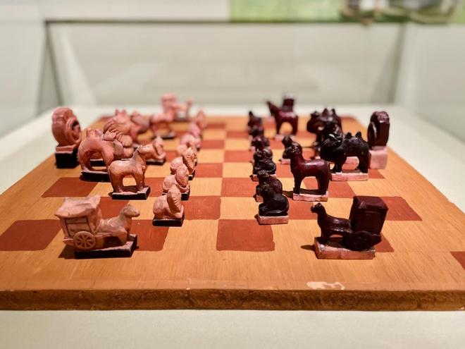 其中清代的景泰蓝马鞍做工精致,木胎马鞍外包鲨鱼皮。鞍桥、鞍翅等边缘处包铜,外饰景泰蓝花卉纹,并配套有两个通饰景泰蓝花卉纹饰的马镫,色彩艳丽,显得古朴典雅;象棋是鄂尔多斯人民日常娱乐的方式,展出的这幅民国时期的蒙古象棋,造型朴拙,棋子雕刻栩栩如生,再现排兵布阵生动场景。这款博弈游戏蒙语称为“沙塔拉”。棋盘纵横八格,共32个棋子,对弈双方各执16子,按规定布局。