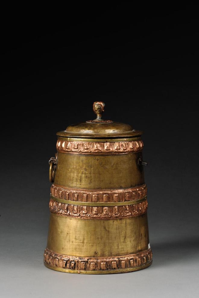 奶桶是草原民族不可或缺的日常器用,是用于盛奶的工具。展出的这件民国铜奶桶器物上、中、下各有一道铜箍,带盖,器身带提环,为同类器物中较为精致的一件。