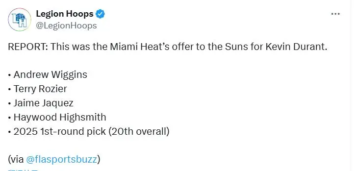 “知情人士透露,热火队愿意用维金斯、罗齐尔、海史密斯、小海梅-哈克斯以及6月选秀大会的20号签来换取杜兰特和科迪-马丁。太阳队希望得到小海梅-哈克斯、约维奇、海史密斯、20号签以及一个选秀权互换(同时也包括维金斯/罗齐尔)。所以……约维奇和雅库乔尼斯(20号秀)需要通过努力来证明这个决定的合理性,这对热火队来说是个艰难的抉择。”
