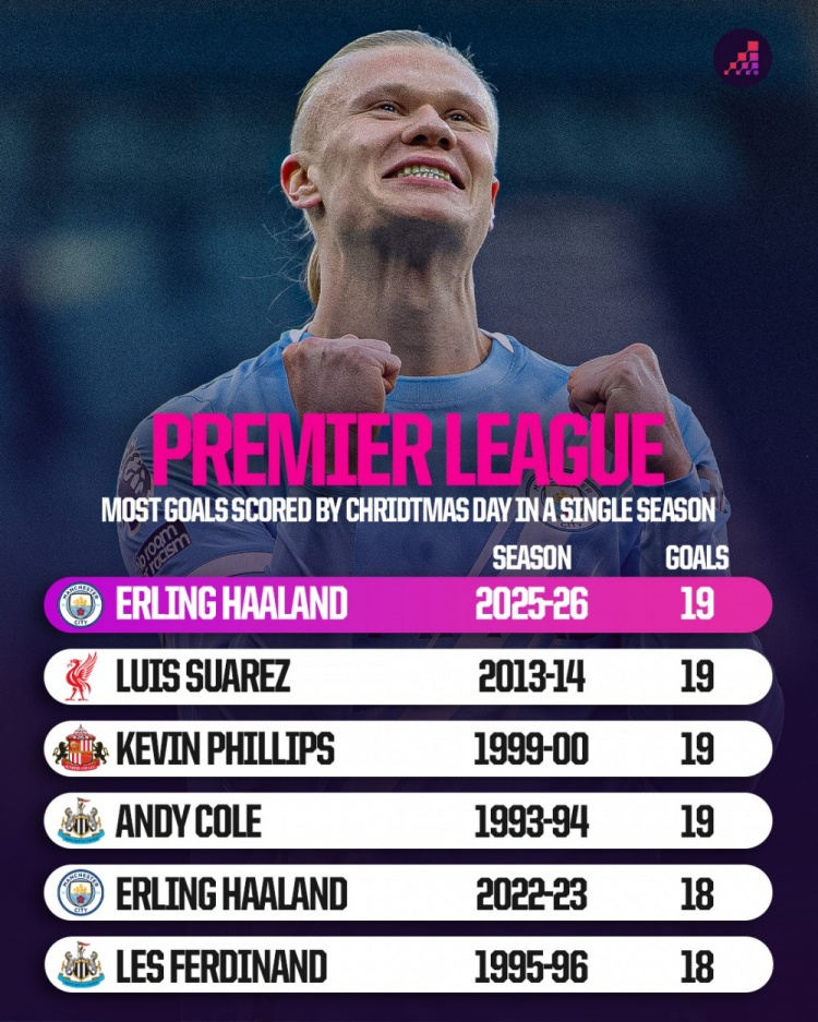 英超单赛季圣诞节前历史射手榜:哈兰德、苏牙、科尔19球并列第1