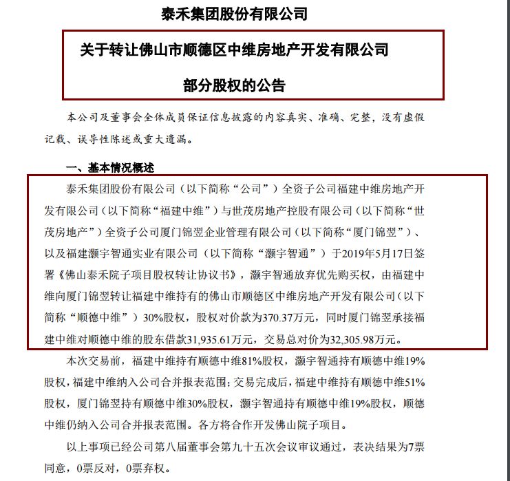 5月17日晚间,泰禾集团再度宣布,向世茂集团出让其位于广州、佛山以及苏州昆山的项目公司股权,交易总对价为39.71亿元。