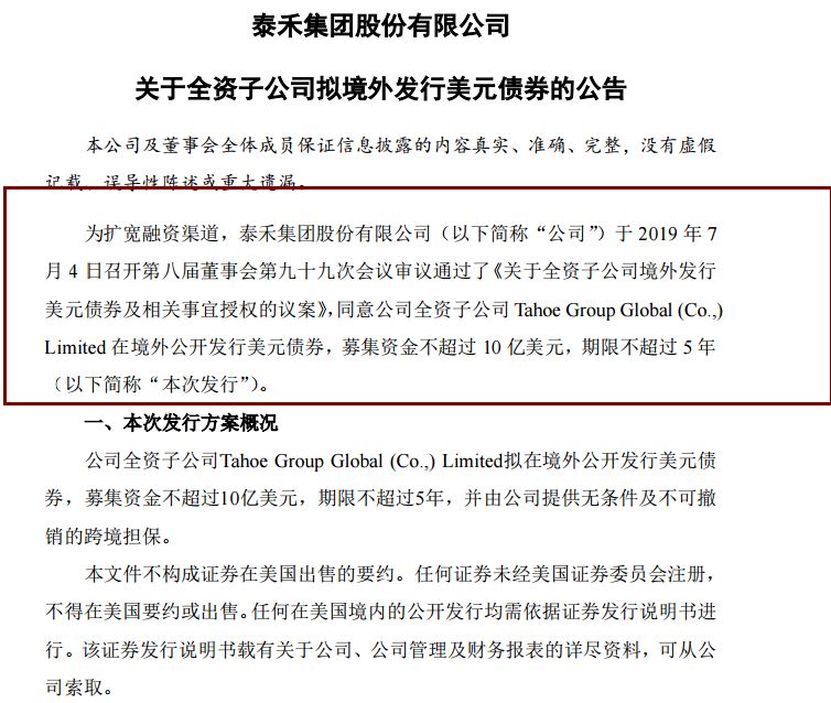 一个星期前的7月5日,泰禾集团公告,同意全资子公司Tahoe Group Global (Co.,) Limited在境外公开发行美元债券,募集资金不超过10亿美元,期限不超过5年。