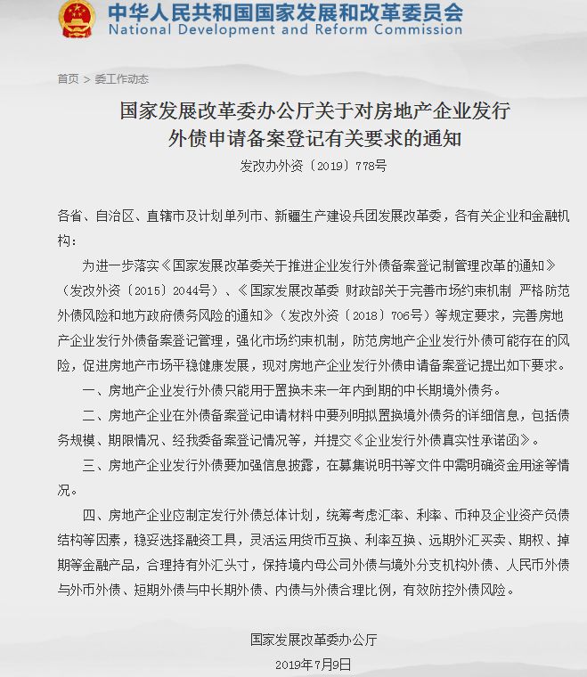 7月12日,发改委官网显示,发改委发布关于对房地产企业发行外债申请备案登记有关要求的通知,房地产企业发行外债只能用于置换未来一年内到期的中长期境外债务。