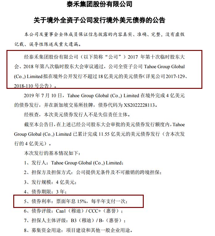 7月12日,泰禾集团股份有限公司发布公告称,泰禾全资子公司Tahoe Group Global (Co.,) Limited拟本次发行4亿美元债券,债券期限3年,债券票面年息15%,每半年支付一次。