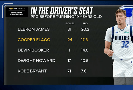 虎扑12月13日讯NBA常规赛,独行侠主场迎战篮网的比赛正在进行中。比赛的第一节,转播画面给出一组数据,内容为19岁前的球员出战场次和得分榜单,详情如下:勒布朗-詹姆斯31场场均20.2分库珀-弗拉格24场场均17.3分德文-布克1场得到14分德
