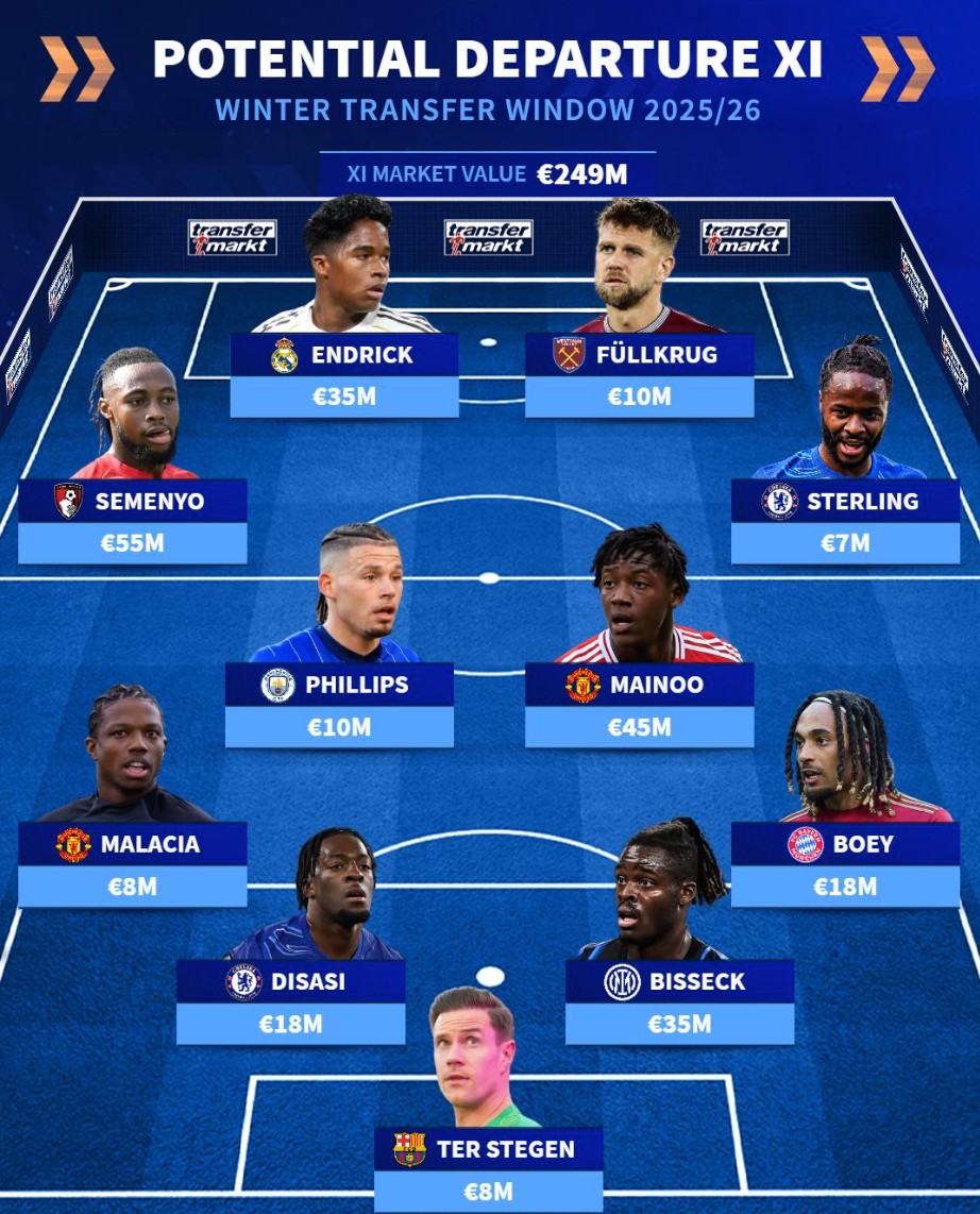 北京时间11月23日,德转列出了冬窗可能转会的最佳11人阵容,塞门约以5500万欧元的身价领衔,恩德里克、斯特林、梅努以及比塞克等名将上榜。德转列冬窗可能离队最佳11人阵容:门将特尔施特根(巴塞罗那)800万欧元后卫博埃(拜仁慕尼黑)180
