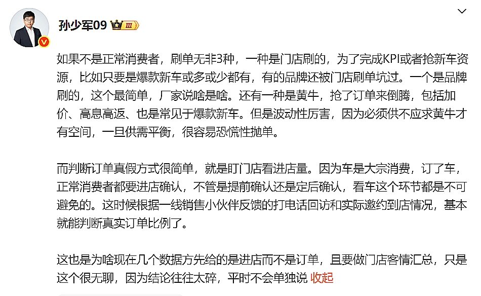 11月3日,知名汽车博主孙少军转发一则关于车企小订单造假的资讯,并详解了汽车刷单方法和成本。详细内容如下: 按照孙少军的说法可以将刷单方式分为三种,分别为:门店刷单品牌刷单黄牛刷单门店刷单是为完成厂家给门店制定的业绩指标(