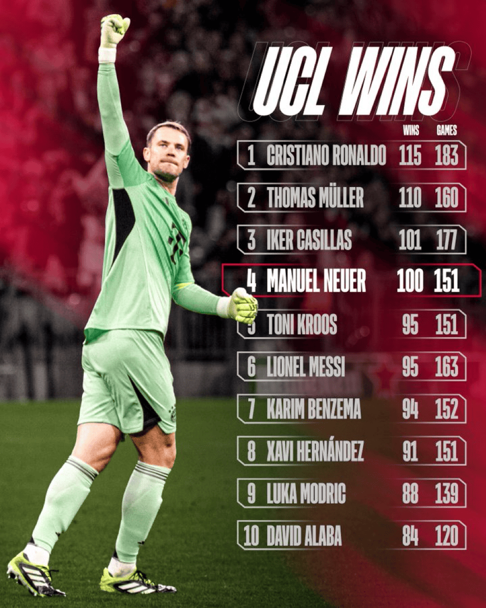 虎扑09月19日讯拜仁官方发布推文称,曼努埃尔-诺伊尔凭借昨天的胜利成为欧冠历史上第四位达成百场胜利里程碑的球员💪🐐【榜单详情】1、C罗,115胜,183场2、穆勒,110胜,160场3、卡西利亚斯,101胜,177场4、诺伊尔,100胜,151场