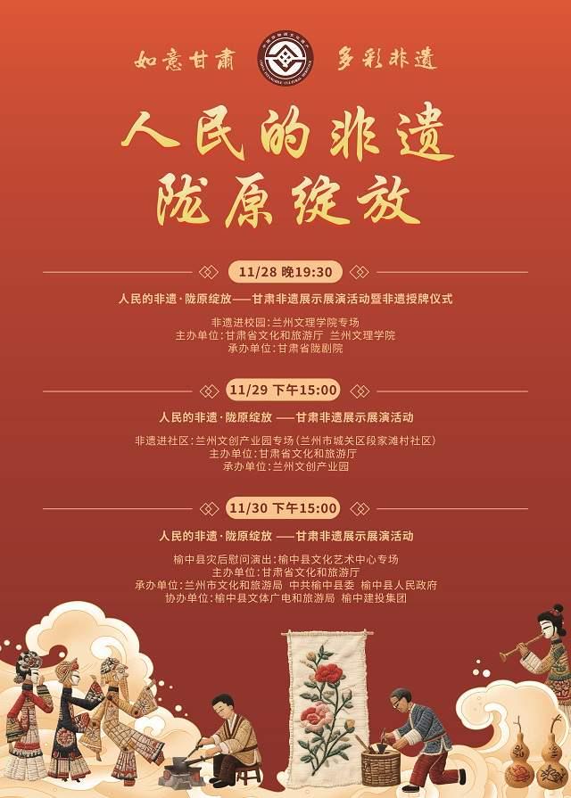 11月28日,“人民的非遗陇原绽放”——甘肃非遗展示展演活动暨非遗授牌仪式将在兰州文理学院拉开帷幕;11月29日,“人民的非遗陇原绽放”——甘肃非遗展示展演活动将走进兰州文创产业园;11月30日,“人民的非遗陇原绽放”——甘肃非遗