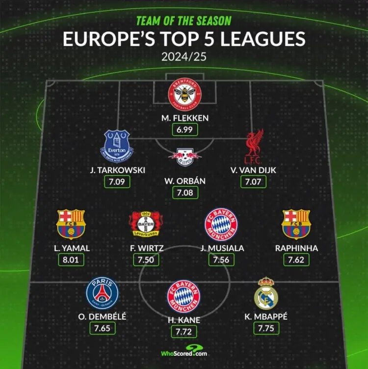就在刚刚,数据网站Whoscored统计了2024~25赛季的五大联赛评分最佳阵容。在将球员的场均评分以及综合表现进行评估后,门将位置给到了布伦特福德球星弗莱肯。他的综合分数为6.99。客观来说,上赛季五大联赛门将当中并没有太过出彩的存在