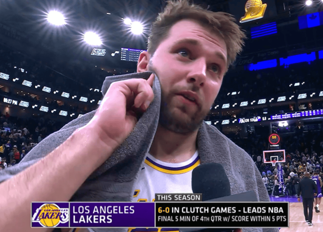 虎扑11月24日讯NBA常规赛,湖人客场108-106战胜爵士。本场取胜后,湖人拿到4连胜,目前他们已经12胜4负,排在西部第二。赛后,在卢卡-东契奇接受采访时,比赛现场转播方给出数据,本赛季至今打到关键时刻的比赛(最后5分钟分差在5分之内