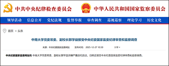 中央纪委国家监委网站12月27日消息,中南大学党委常委、副校长郭学益涉嫌严重违纪违法,目前正接受中央纪委国家监委纪律审查和监察调查。 公开资料显示,郭学益,男,汉族,1966年10月生,湖南望城人,1991年5月加入中国共产党,1995年