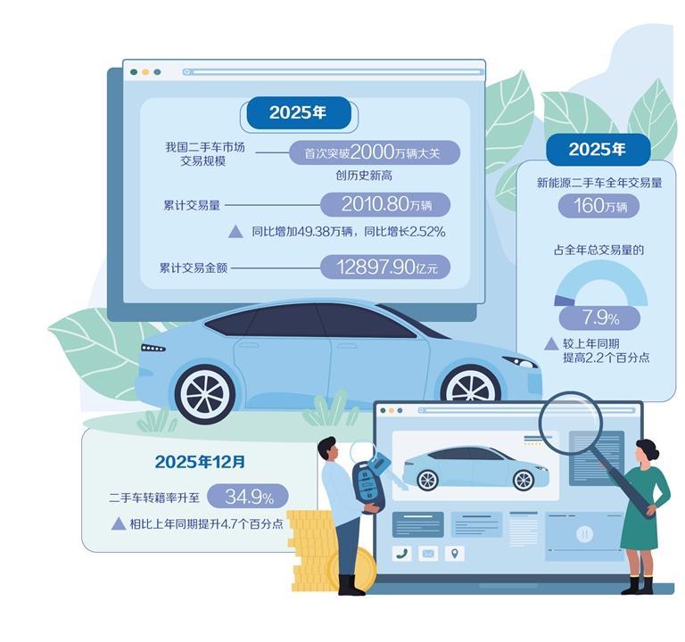 本文转自:经济日报去年全年突破2000万辆大关——二手车市场流通效率提升本报记者吉亚矫2025年,我国二手车市场交易规模在政策支持、新能源汽车渗透率提升与数字化加速等多因素的推动下,首次突破2000万辆大关,创历史新高。中国汽车流