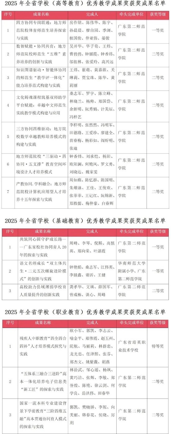 近日,广东省人力资源和社会保障厅、广东省教育厅联合发布《关于表彰全省学校优秀教学成果奖(基础教育与职业教育类)的决定》(粤人社发〔2026〕4号)。结合此前公布的《关于表彰全省学校(高等教育)优秀教学成果奖的决定》(粤人社发