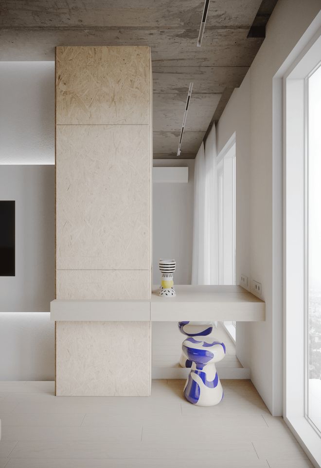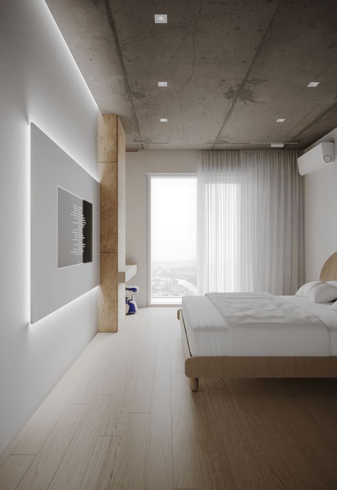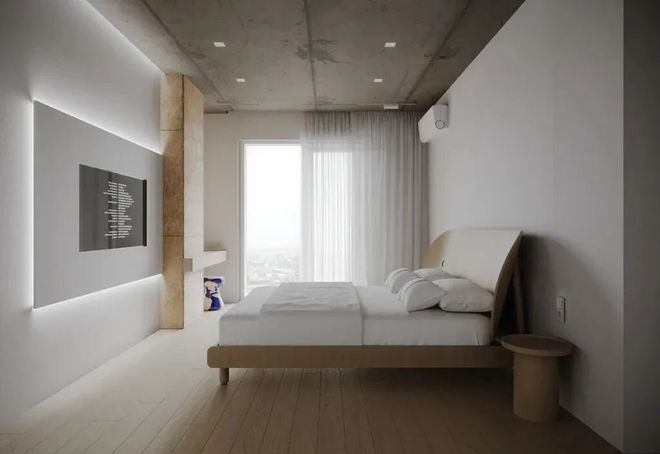 4.卧室:木床架 + 混凝土顶好有氛围!居然又看到了标志性蓝陶瓷凳!瞬间和整个 Loft 呼应上,细节控狂喜!