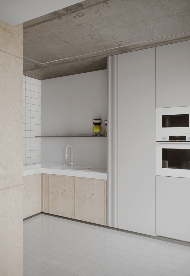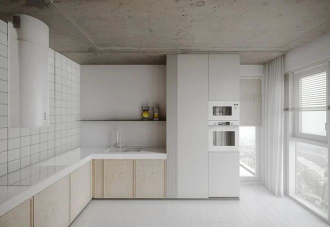 3.厨房:浅木橱柜 + 白色台面太清爽!自然光漫进来,连内置电器都透着极简的精致感,做饭都变开心了~