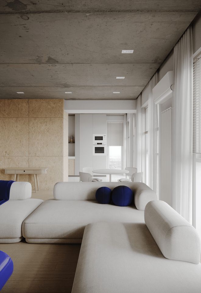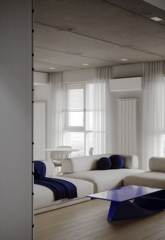 2.客厅:沙发软到想瘫,纱帘滤进来的光绝了!暖木色打底超温柔,直到看见电光蓝咖啡桌 —— 不吵不闹,但眼里只剩它!