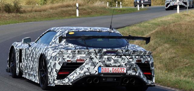 车身尺寸方面,新车预计长宽高达到 4900×2000×1150mm,长车头、短座舱的比例完美复刻GT3赛车比例。车身侧面双门设计搭配宽体轮拱,隐藏式门把手与碳纤维侧裙降低风阻,定制化多辐式轮毂包裹高性能刹车卡钳,赛道气息扑面而来。车尾部分,高跷的直角形扰流板与贯穿式尾灯形成呼应,底部扩散器与双边共四出排气布局,进一步释放性能信号。