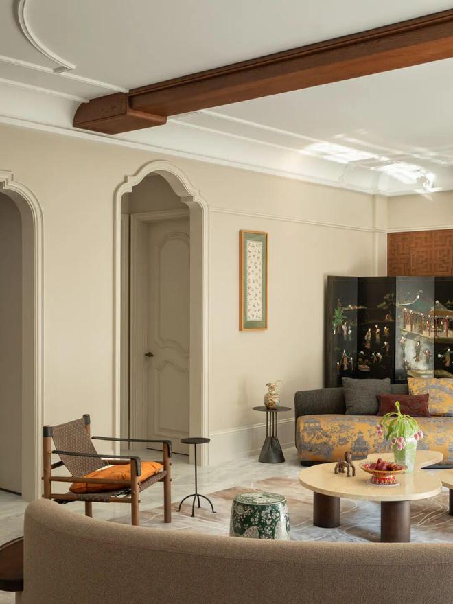 女主人曾明确提出,希望这个家的“底子”足够干净。设计师将“干净”转译为一种能够容纳多元审美的空间基底:将中式的木作线条、法式雕花细节,大理石的精致与老家具本身的岁月痕迹,自然地揉合进同一个场景,让生活自己讲述丰满。