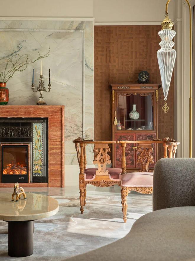 客厅中的古董壁炉是设计师与屋主在某个深夜不期而遇